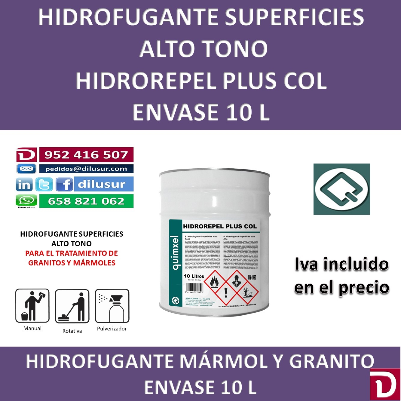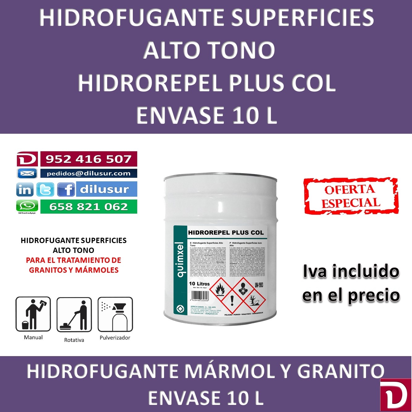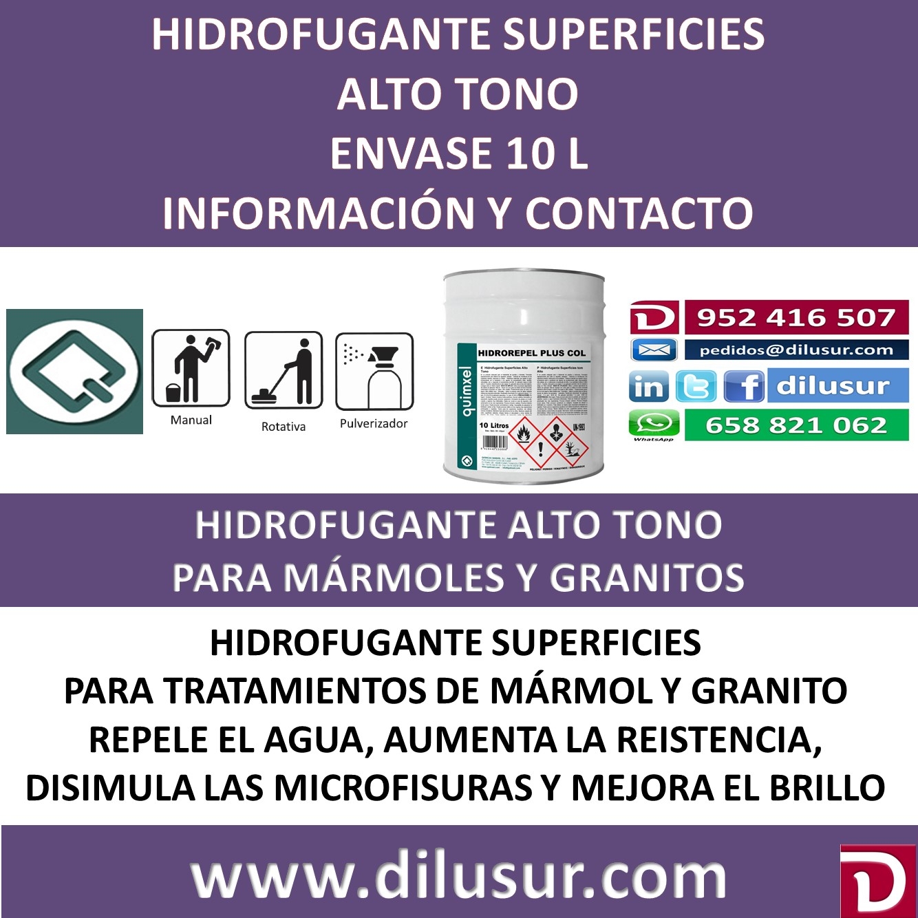 Hidrofugante superficies alto tono, para el tratamiento de granitos y mármoles, disimula las microfisuras en las superficies, repelente de agua y resistente al envejecimiento, realza el brillo. Envase 10 L. Iva incluido
